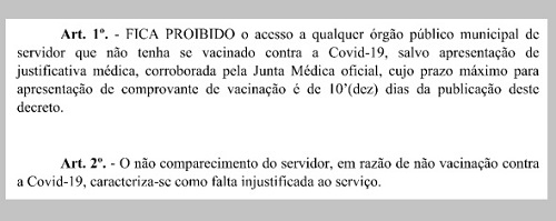O texto também diz que não ir trabalhar por falta de vacina será contado com falta injustificável.