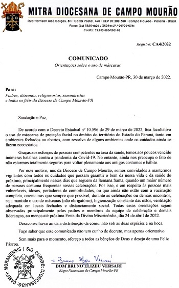 D. Bruno Versari, bispo de Campo Mourão, em comunicado em que recomenda que seja mantido o uso das máscaras durante as celebrações religiosas, pelo menos até o próximo dia 24. Segundo ele, neste período costuma aumentar a presença de fieis na igreja.