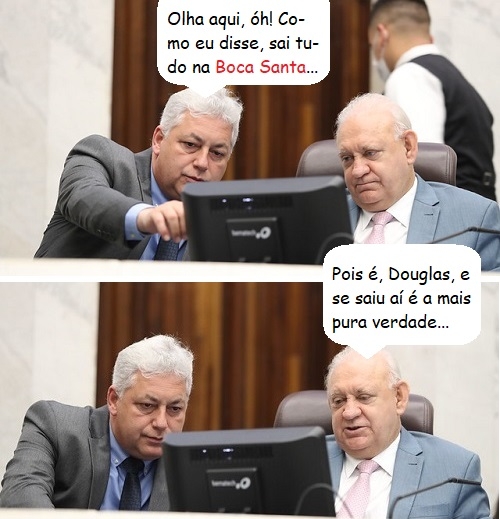 Os cliques são da sessão desta segunda-feira da Assembleia Legislativa do Paraná, em Curitiba. O deputado Douglas Fabrício, de Campo Mourão, e o presidente Ademar Traiano observam alguma coisa na telinha do computador. Será o balãozinho da Boca Santa?...
