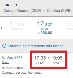 Aos sábados o voo sai de Campo Mourão às 14h e chega a Curitiba às 15h30. Da capital para cá sai às 11h45 e chega às 13h35.