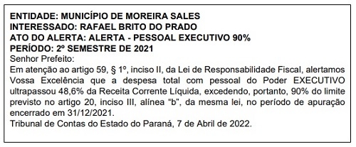 A publicação do Tribunal de Contas do Estado saiu nesta terça-feira. O município encerrou 2021 comprometende acima de 48,6% da receita corrente líquida com a folha de pagamento. Não estourou o limite de 54% da Lei de Responsabilidade Fiscal, mas já rendeu o alerta para o prefeito Rafael Bolacha.