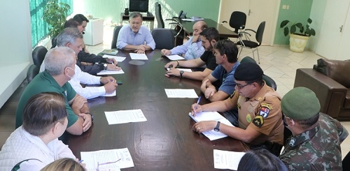 Prefeito Tauillo Tezelli, secretários municipais, Núcleo de Educação, Polícia Militar, Polícia Civil e Tiro de Guerra se reuniram nesta segunda-feira na prefeitura de Campo Mourão. Em pauta, a segurança e a logística para a fase final dos Jogos Escolares do Paraná. O município vai sediar os Jep"s de 15 a 23 de julho. Cerca de 6 mil alunos-atletas, de 12 e 14 anos, e dirigentes estarão na cidade.