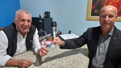 No próximo dia 24 acontece a 14.a Festa o Carneiro Recheado, o prato típico de Altamira do Paraná. Faz parte das comemorações pelos 40 anos do município. O convite custa R$ 40 (criança de 8 a 12 anos paga R$ 15). Reservas podem ser feitas pelos fones (44) 9 9819-4381 e 9 9839-2221. Na foto, o prefeito José Etevaldo Branco com o convite para o prefeito vizinho Milton Luiz Alves, de Campina da Lagoa.