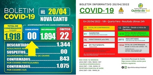 Pelo menos 18 prefeituras da região divulgaram durante a semana boletins atualizados da covid-19. Nova Cantu zerou mais uma vez. Está sem casos ativos. Já Quinta Sol pôs o boletim em vermelho. Pudera. Confirmou 33 novos casos e foi a 44, isto um mês depois de ter zerado os casos ativos.