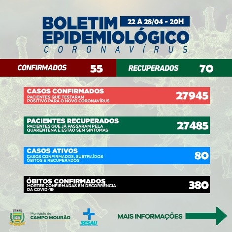 Campo Mourão está com 80 casos ativos de covid-19. É o que mostra o boletim divulgado nesta quinta-feira. Nos últimos sete dias foram confirmados 55 casos, média de 7,8 por dia. Os recuperados foram 70. Não há ninguém internado devido à doença, nem na enfermaria, nem na UTI, nem da região, nem de Campo Mourão.