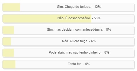 "Depois do 21 de abril, o comércio de Campo Mourão deve voltar a abrir em dia de feriado?" Enquete foi encerrada neste domingo. Não teve nem graça. Vitória da alternativa "Não. É desnecessário", com 58% dos votos. "Sim. Chega de feriado" teve só 12% na segunda posição. Nove por cento foi no "Tanto faz". O resultado completo está no quadro acima.