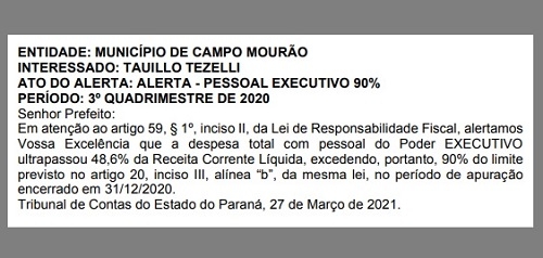 O Tribunal de Contas do Estado publicou nesta terça-feira alerta para a prefeitura de Campo Mourão.