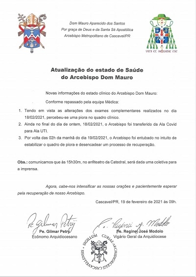 O arcebispo de Cascavel, d. Mauro Aparecido dos Santos, foi transferido nesta quinta-feira à noite para a UTI. Já na madrugada desta sexta-feira foi entubado. Ele está internado desde terça-feira, com covid-19. As informações são da Arquidiocese de Cascavel. D. Mauro, que tem 66 anos, foi bispo de Campo Mourão de 1999 a 2007.