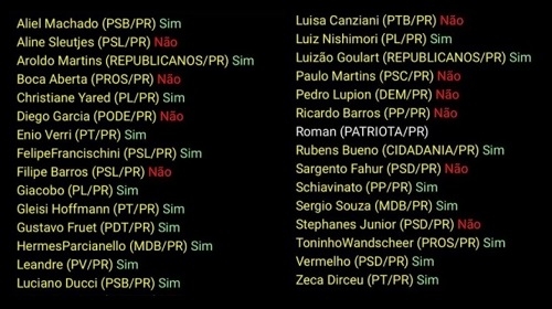 Por 364 votos a 130, a Câmara dos Deputados decidiu, nesta sexta-feira, manter a prisão do deputado Daniel Silveira (PSL/RJ). No Paraná, foram 19 votos para mantê-lo preso (sim) e 10 contra (não), além de uma abstenção. O ex-prefeito de Campo Mourão, Rubens Bueno (Cidadania), votou pelo "sim" (prisão). Zeca Dirceu (PT), Hermes Frangão (MDB) e Luiz Nishimori (PL) também. Já entre os "não" ficaram Sargento Fahur (PSD) e Ricardo Barros (PP).