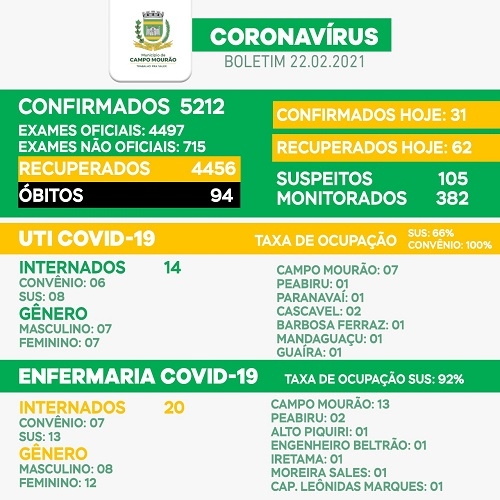 Segunda-feira "positiva" no boletim covid de Campo Mourão. O número de novo casos (31) foi a metade dos recuperados (62). Os casos suspeitos caíram para 105. E a UTI/SUS voltou a ter ocupação reduzida para 66%. A má notícia do dia é que a UTI/convênio ficou lotada (100%).