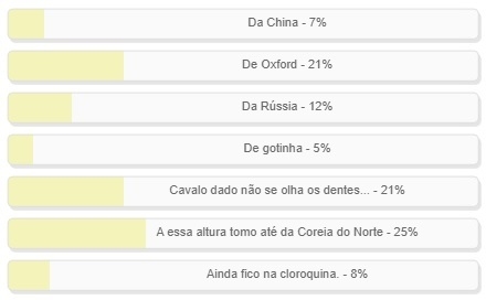 "A essa altura tomo até da Coreia do Norte" foi a alternativa mais votada em enquete encerrada neste domingo. Teve 25% dos votos. "Cavalo dado não se olha os dentes" e a de "Oxord" empataram na segunda posição, com 21%. Outros 12% foram na alternativa da "Rússia" e 8% ainda preferem ficar na cloroquina. O resultado completo está no quadro acima.