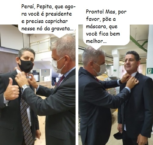 Em Campo Mourão, na hora da posse, o vereador Edilson Martins ajuda o colega Jadir Pepita a fazer o nó da gravata. Pepita foi eleito presidente por unanimidade. Edilson se dizia candidato, mas desistiu e na hora anunciou voto ao colega. Portanto, não basta votar, tem que dar uma mãozinha na gravata...