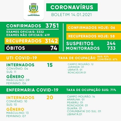 Quinta-feira de poucos novos casos confirmados de covid-19 em Campo Mourão. Foram 6, com 58 recuperações. Assim, o número de mourãoenses com o vírus ativo caiu para 535. A UTI está com 15 pacientes. Entre os leitos do SUS a taxa de ocupação é de 92%. Há 26 moradores de Campo Mourão internados - 12 na UTI e 14 na enfermaria.