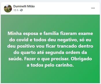 Em outra postagem, frisou que só ele da família contraiu o vírus.