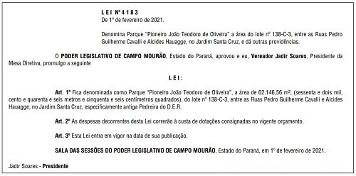 A lei foi promulgada nesta terça-feira pelo presidente da Câmara de Campo Mourão, Jadir Pepita.