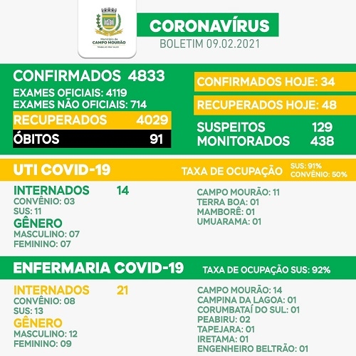 Pelo oitavo dia Campo Mourão teve mais recuperados (48) do que novos casos de covid-19 (34). Só que o número de moradores com o vírus ativo segue alto (713). Nesta terça-feira houve a confirmação da 91ª morte por coronavírus. O índice de ocupação de leitos está em 91% na UTI/SUS e 92% na enfermaria.