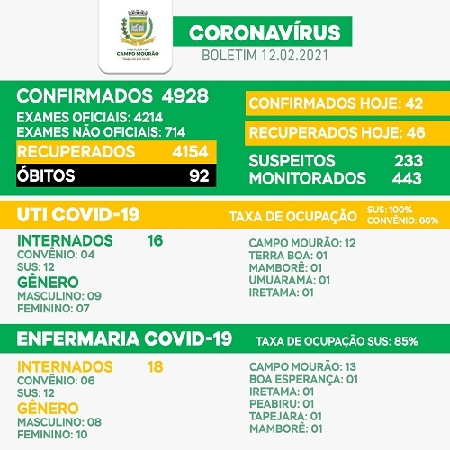 Mais 42 casos de covid-19 foram confirmados nesta sexta-feira em Campo Mourão. Os recuperados foram 46. Foi o 11° dia seguido de mais recuperações que novos casos, mas as boas notícias param por aí. O número de confirmações diárias segue alto, na ala covid da Santa Casa a UTI/SUS continua lotada e o número de casos suspeitos subiu de 175 para 233.