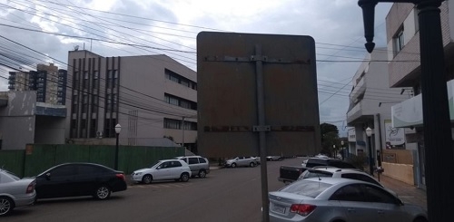 A placa na rua Harrison José Borges, no centro de Campo Mourão, está suja e enferrujada faz tampo. Agora ainda aparece apontada para o lado errado.