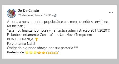 A frase é do prefeito de Boa Esperança, Zé do Caixão, e foi usada em mensagem de fim ano nas redes sociais.