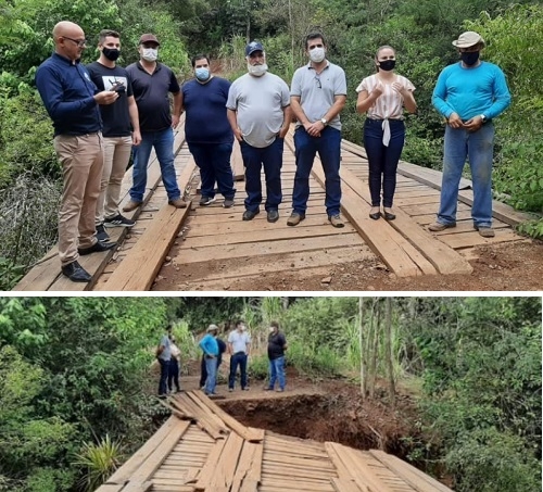 Os prefeitos Same Saab (Iretama) e Vivaldo Lessa (Roncador) se reuniram nesta quarta-feira sobre a ponte do Rosilho, que divide os dois municípios. Ou sobre o que restou dela. Parte da ponte caiu com a chuvarada do início ano e o local está intransitável. A ideia é fazer uma ponte nova de concreto, mas para isso as prefeituras esperam recursos federais. "Não adianta fazer quebra-galhos aqui, não", avisou Same.