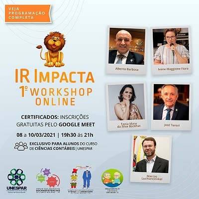 O Fórum das Entidades Sócio-assistenciais de Campo Mourão e o curso de ciências contábeis da Unespar vão realizar de 8 a 10 destes mês o IR Impacta. Será um workshop online para levar informações sobre a campanha de destinação de parte do Imposto de Renda para os fundos municipais dos Direitos da Criança e do Adolescente e do Idoso. A inscrição é gratuita.