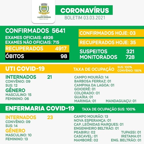 O boletim covid desta quarta-feira traz a confirmação de apenas três novos casos em Campo Mourão. Um alívio perto dos 183 dos dois últimos dias. Mas houve mais uma morte (mulher de 83 anos). Os casos suspeitos subiram de 127 para 321. Na Santa Casa, a ala covid segue lotada, voltando a ter 150% de ocupação na UTI/Convênios.