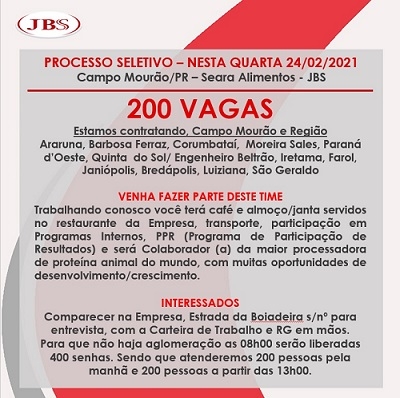 A JBS fará seleção de pessoal nesta quarta-feira para contração de 200 funcionários em Campo Mourão. Interessados devem proucrar a empresa, na Estrada Boiadiera. Serão distribuídas 400 senhas a partir das 8h desta quarta-feira. O abatedeouro oferece transporte para moradores de 10 cidades da região (veja acima).