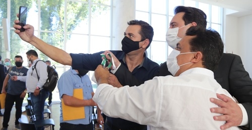 O deputado estadual Douglas Fabrício participou, nesta terça-feira, da entrega de 46 vans para a Saúde feita pelo governador Ratinho Jr. Ficou sentado atrás do vice-goverandor Darci Piana. Os veículos foram comprados através de emendas parlamentares, daí a presença do deputado.
