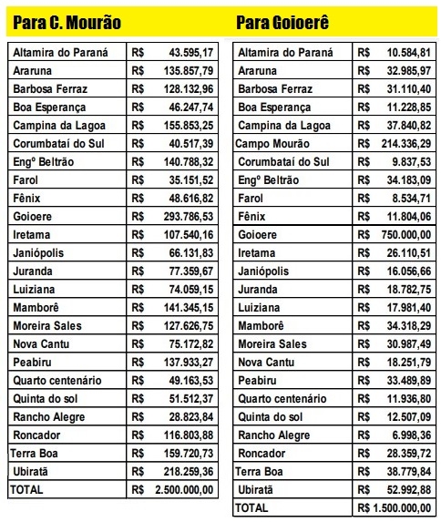 As prefeituras da região farão repasses de R$ 2,5 milhões para a Santa Casa de Campo Mourão e de R$ 1,5 milhão para a Santa Casa de Goioerê. Isso será feito já no próximo dia 20, através do Cis-Comcam. Como a prefeitura de Campo Mourão já repassou, ano passado, R$ 2,5 milhões, não repassará agora para o hospital mourãoense, mas vai ajudar com R$ 214,3 mil para a Santa Casa goioerense. Os quadros acima mostram quanto repassarão cada prefeitura.
