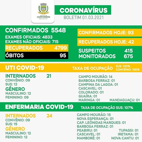 Campo Mourão abriu o mês de março com a confirmação de mais 93 casos de covid-19. É um dos maiores números para um único dia. Na ala covid da Santa Casa estão internadas 45 pessoas, sendo 29 mourãoenses. Na UTI/convênios o índice de ocupação subiu para 150%. Na UTI SUS segue em 100% e na enfermaria 107%.