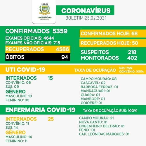 Caiu de 100% para 75% o índice de ocupação da UTI Covid da Santa Casa de Campo Mourão. Eram 12 e ficaram nove leitos utilizados. A UTI Convênios e a enfermaria seguem lotadas. As informações estão no boletim desta quinta-feira. O dia teve mais 68 casos confirmados no município. Bem acima da média. Os casos suspeitos voltaram a subir e foram a 218.