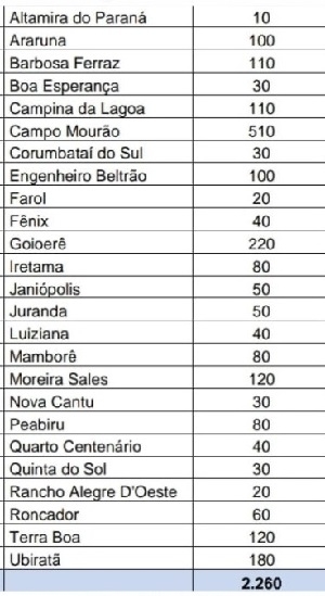 Onde? - Barbosa Ferraz 2, Campina da Lagoa 4, Corumbataí do Sul 1, Engenheiro Belttrão 7, Fênix 1, Goioerê 4, Iretama 12, Janiópolis 1, Juranda 5, Luiziana 7, Moreira Sales 12, Nova Cantu 3, Peabiru 5, Quinta do Sol 1, Rancho Alegre do Oeste 5, Terra Boa 16 e Ubiratã 12.