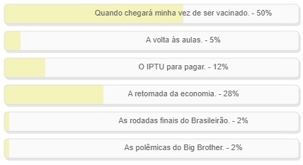 Enquete com essa pergunta foi encerrada neste domingo. Venceu, disparado, a alternativa "Quando chegará a minha vez de ser vacinado", com 50% dos votos. "A retomada da economia" teve 28%. "O IPTU para pagar" ficou em terceiro, com 12%. O resultado completo está no quadro acima.