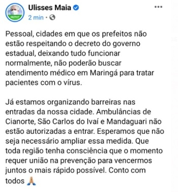 Em redes sociais ele disse que barreiras nas entradas da cidade vão impedir ambulâncias desses municípios.