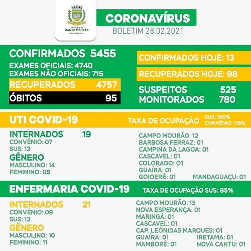 Campo Mourão teve 13 casos e mais uma morte confirmados de covid-19 neste domingo. Um homem de 71 anos foi o 95° morrer pela doença. Assim, fevereiro terminou com 876 casos (média de 31,28 por dia) e 10 óbitos. Neste ano são 2.146 casos e 30 mortes.