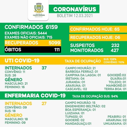 Mais três moradores de Campo Mourão morreram de covid-19 nas últimas horas. Idades: 48, 51 e 55 anos. A sexta-feira teve mais 65 casos confirmados e o total de mourãoenses com vírus ativo subiu para 949. Na UTI mais um recorde, com 37 internados. O índice de ocupação foi a 108% no SUS e 110% nos convênios.