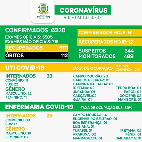 Campo Mourão está perto de ter mil moradores com o vírus ativo pela primeira vez desde o início da pandemia. Pelos números do boletim deste sábado são 997. O município teve mais 61 casos confirmados. Confirmada também mais uma morte por covid-19 (homem de 67 anos). Agora são 112, sendo 17 somente este mês. Na UTI SUS, o índice de ocupação caiu para 91%.