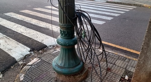 Av. Manoel Mendes de Camargo esquina com rua Interventor Manoel Ribas. A "fiozeira" caida é tanta que o jeito foi enrolar tudo e amarrar no poste republicano.
