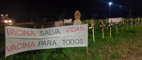 Na entrada de Cruzeiro do Oeste, faixa cobra "vacina para todos" e cruzes simbolizam as 35 pessoas da cidade que já morreram de covid-19.