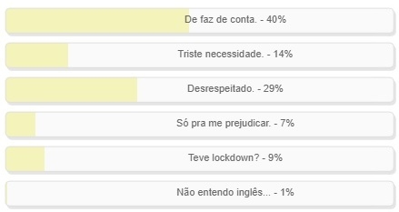 Essa foi a alternativa mais votada em enquete encerrada neste domingo. Teve 40% dos votos. Outros 29% preferiram a alternativa "desrespeitado". Já para 14% foi uma "triste necessidade". O resultado completo está no quadro acima.