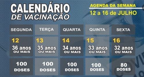 A Secretaria de Saúde de Peabiru pretende vacinar, até sexta-feira, moradores de 32 anos. É o que prevê calendário divulgado no domingo. Começou com 36 anos, nesta segunda-feira, e vai reduzindo um ano a cada dia. As doses, no entanto, são limitadas. Até quinta-feira serão 100 por dia. Na sexta diminui para 80. A secretaria distribui senhas pela manhã e aplica a vacina à tarde, no ginásio de esportes.