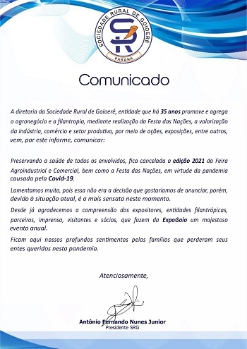 A Sociedade Rural de Goioerê divulgou comunicado nesta sexta-feira para dizer que não será possível realizar este ano a Expogoio, assim como a Festa das Nações. O motivo, claro, a pandemia. A festa já tinha sido cancelada no ano passado. A Expogoio ocorre sempre em agosto, como parte das comemorações de aniversário da cidade (dia 10).