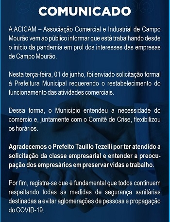 A Acicam divulgou nota agradecendo ao prefeito Tauillo Tezelli.