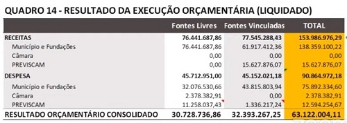 Ou seja, houve superávit orçamentário de R$ 63,1 milhões.