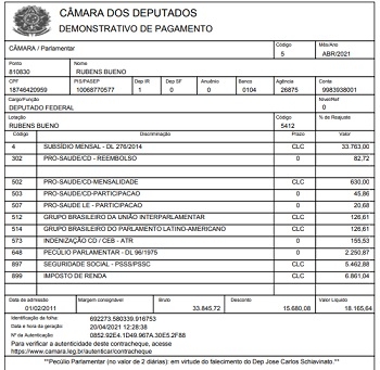 O deputado federal Rubens Bueno, que foi prefeito de Campo Mourão (1993/96), segue publicando todo mês o holerite em seu site oficial. Você sabe quando ganha um parlamentar federal? Brutos são R$ 33,7 mil. Líquidos, R$ 18,1 mil. São R$ 15,6 mil de descontos, com destaque para Previdência (R$ 5,4 mil) e Imposto de Renda (R$ 6,8 mil).