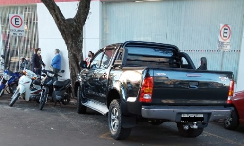 Camionete estaciona sobre vagas excluvivas para motos na rua Harrison José Borges, centro de Campo Mourão.