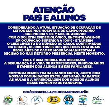 Os diretores de sete colégios estaduais regulares de Campo Mourão divulgaram nota neste domingo contra o retorno das aulas presenciais. Levaram em consideração a ocupação hospitalar e o aumento dos casos de covid-19 nos últimos dias. "Essa é uma medida que assegura a segurança e a vida de professores, funcionários e também dos alunos e seus familiares", destaca trecho da nota.