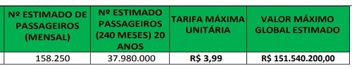 O documento estima o transporte de 158,2 mil passageiros por mês.