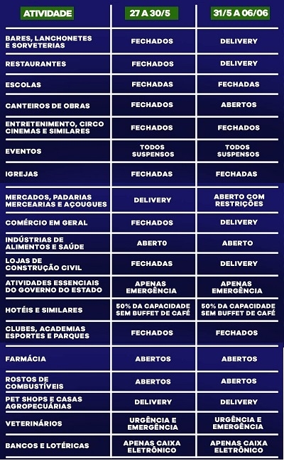 O comércio seguirá fechado de 31 a 6 de junho, mas com delivery liberado.