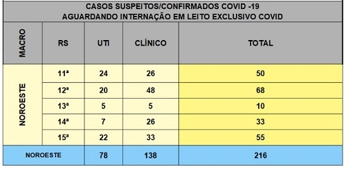 Juntos os 25 municípios da região têm 50 pessoas com covid-19 (ou suspeita) a espera de vagas em hospitais. É o que mostra boletim divulgado pela Secretaria de Estado da Saúde, neste sábado, às 10h40. Do total, 24 precisam de UTI e 26 de enfermaria. Em toda a Macronoroeste, que envolve mais quatro regionais, a fila é de 216 pessoas - 78 para UTI e 138 para clínico.